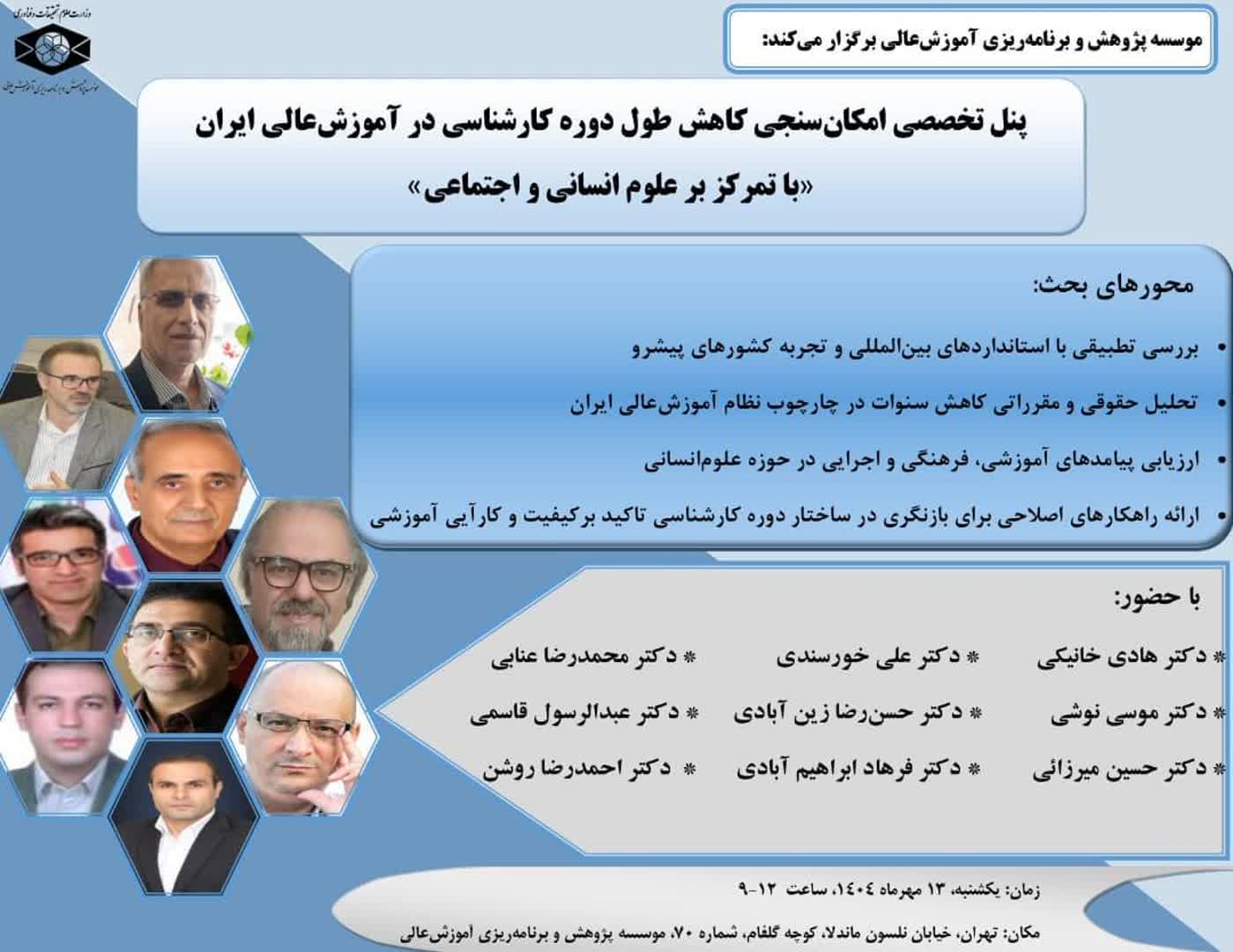مؤسسه پژوهش و برنامهریزی آموزش عالی برگزار میکند: پنل تخصصی امکانسنجی کاهش طول دوره کارشناسی در آموزش عالی ایران: با تمرکز بر علوم انسانی و اجتماعی